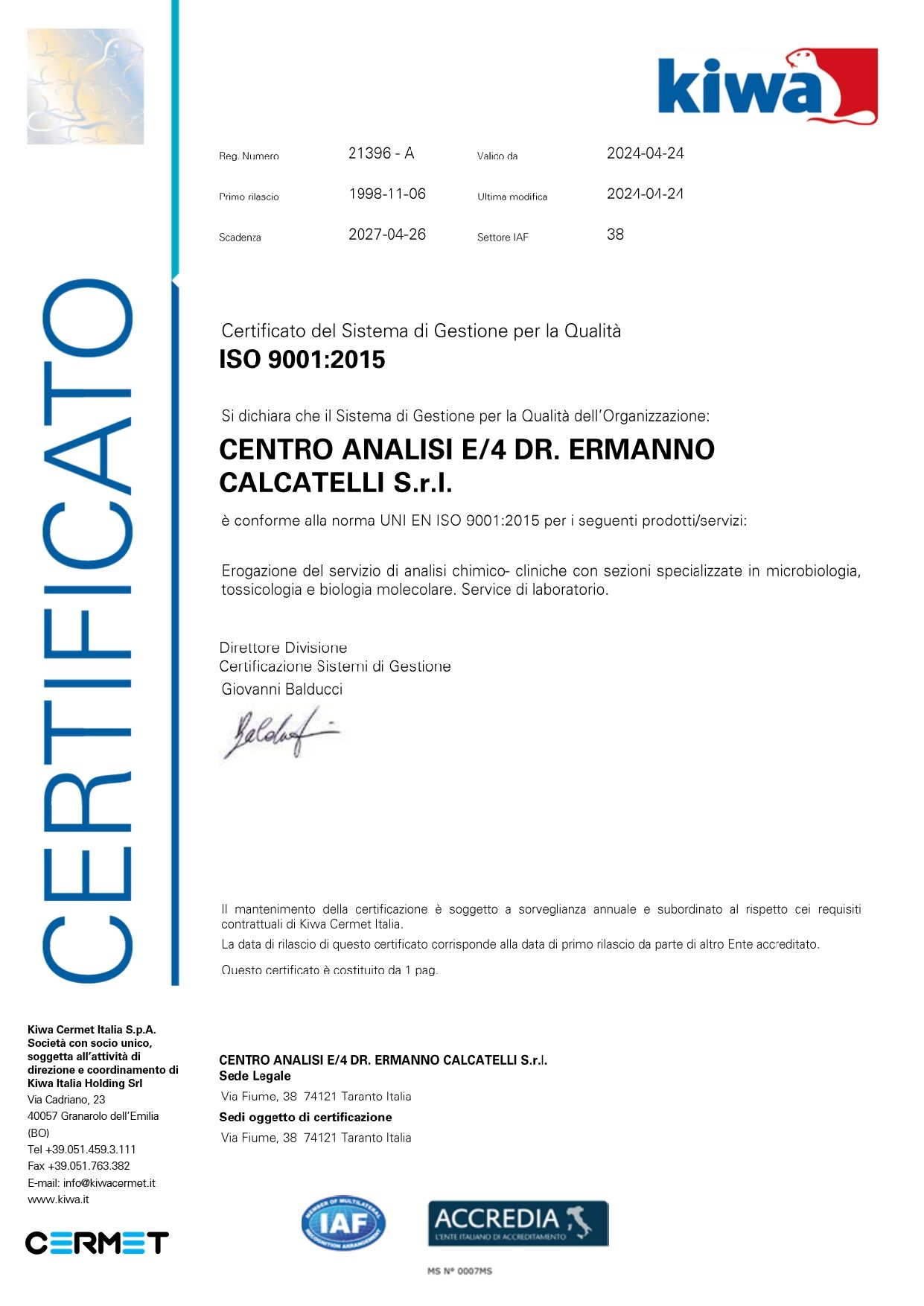 Il Centro Analisi E4 di Taranto è un laboratorio diagnostico certificato che risponde pienamente ai criteri del Sistema di Qualità UNI EN ISO 9001:2015. I requisiti di questa norma individuano un sistema di qualità dove è sempre previsto: